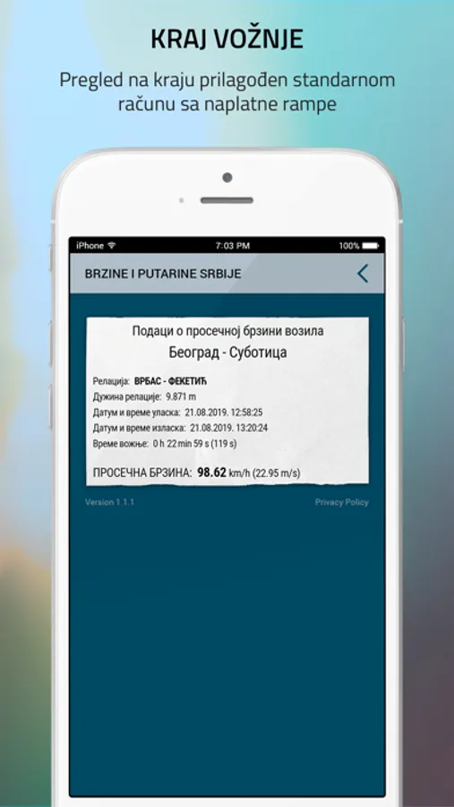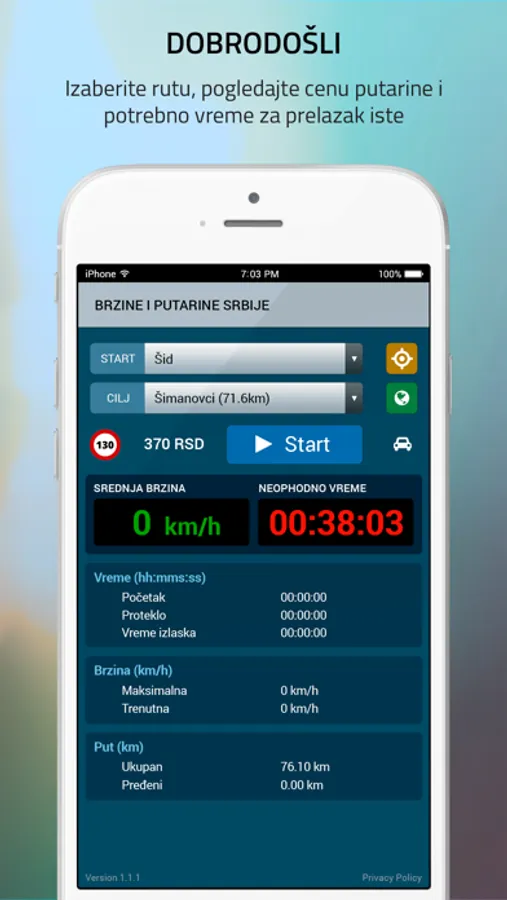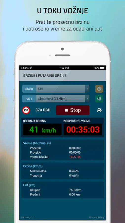 Ova aplikacija prati vašu prosečnu brzinu kretanja i daje vam važne informacije, kao što su dužina potrebne pauze ili za koliko da smanjite brzinu da bi ostali u okvirima dozvoljene brzine kretanja na autoputu. Možete pronaći informacije o vremenu stizanja na željeni izlaz sa autoputa, ceni putarine kao i preostaloj kilometraži.