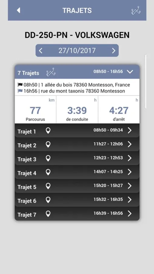 • Journeys: find the details of the journeys made: cartographic route, distance, driving time, average speed, consumption, CO2 emissions, etc.