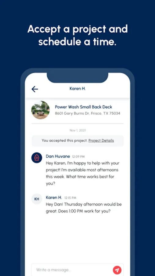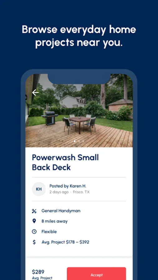 Browse everyday home projects in your area. First come first serve, accept a project, schedule a time, and get it done. We give your customers a price estimate based on trends in your area, but ultimately it’s up to you to determine an agreed upon price based on the specific project, and work involved.