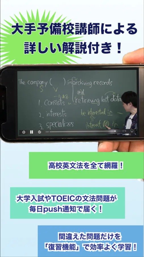 「プロ講師の解説」×「文法習得に特化した良問」×「アプリの6大機能」で効率よく英文法の総復習ができるので、高校英文法を復習したい大人の方にもお勧めです。