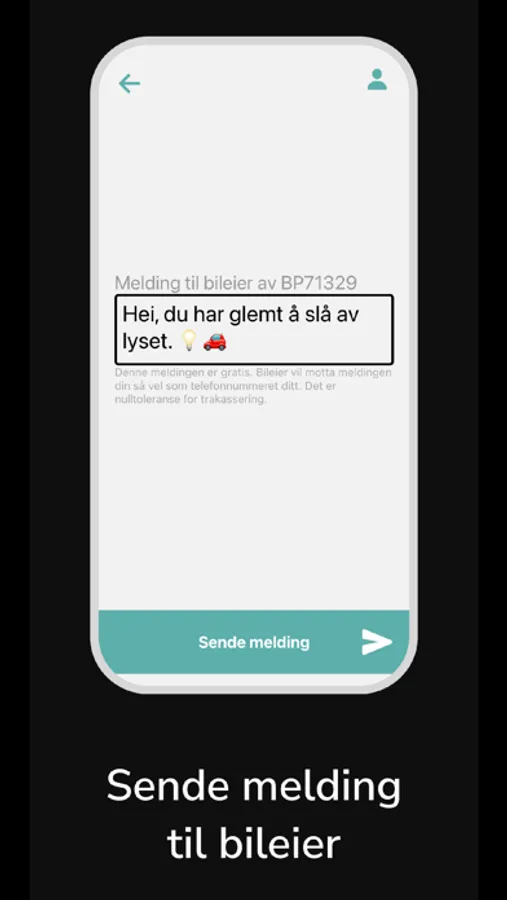 Sende melding til bileier. Det eneste du trenger å vite er registreringsnummer. Dette er gratis funksjon.