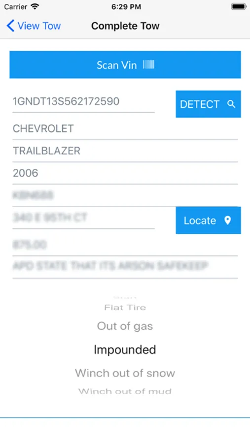 Enter Car data such as damages and type of tow (flatbed, winch)