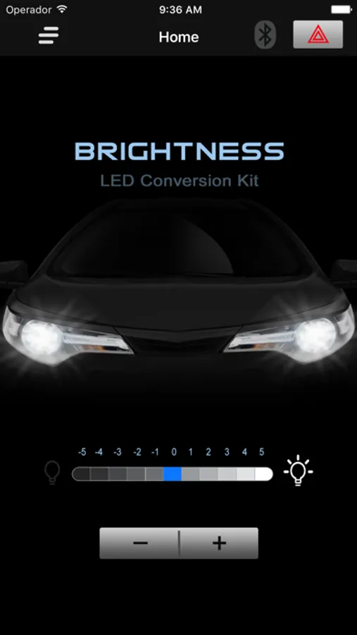 The App includes a Hazard Warning Light function, next to the Bluetooth symbol. Press the symbol to turn the flashing on/off. While Hazard Warning Light is turned on, user can adjust the brightness using the meter. The flashing lights brightness level will adjust on both the headlights on the vehicle and on the App.