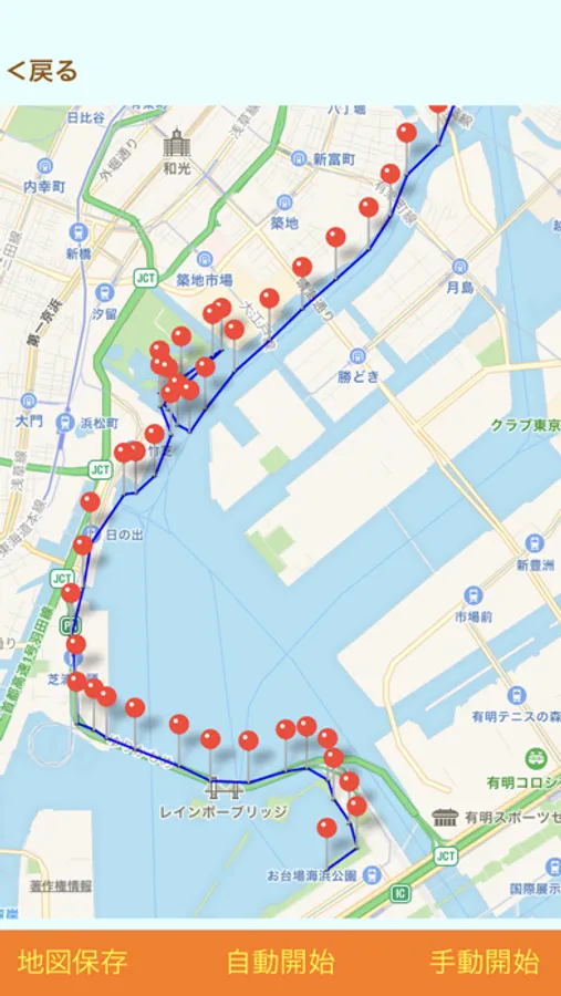②自動開始ボタン、または手動開始ボタンをクリックし地図へのマークを付けを開始します。