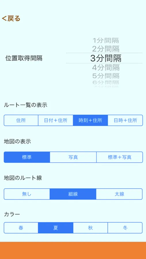 マークの記録間隔、地図の表示方法、画面の色などの設定を行います。