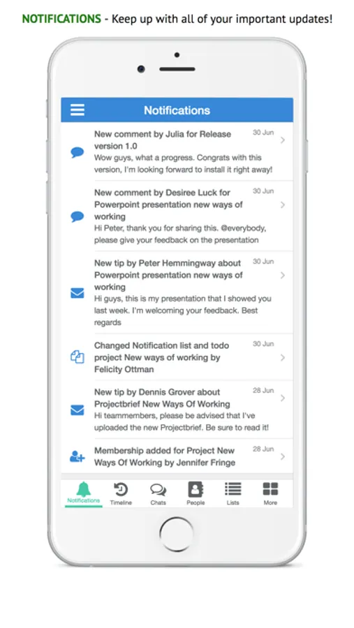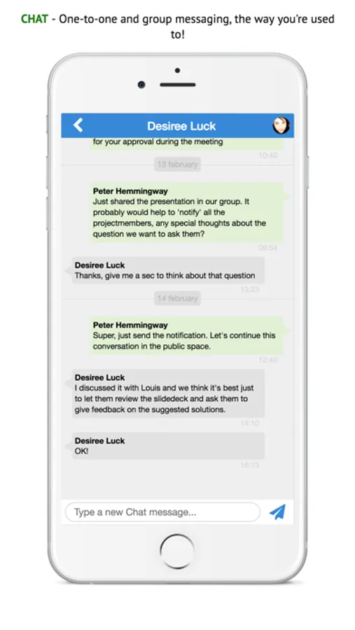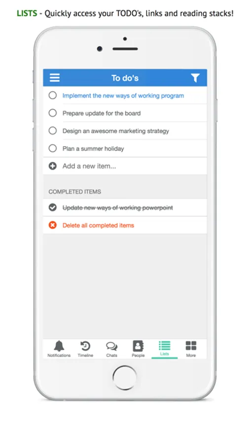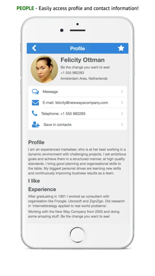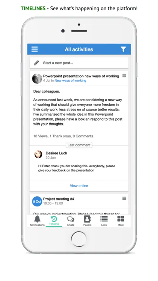 Post something in your group, check out your timeline, send a chat to a coworker or look up his/her contact information, it's all a matter of seconds with this app!