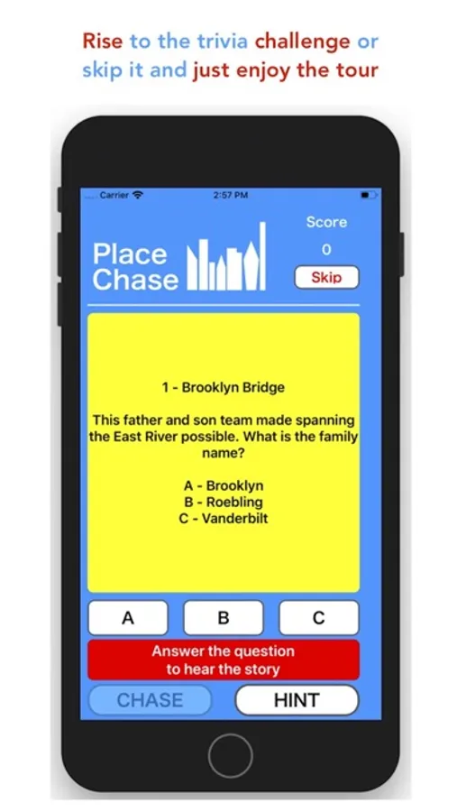 PlaceChase is a great way to explore the City on your own or with friends and family. Kids will truly enjoy the Chase and its competitive take on sightseeing. PlaceChase will entertain, whether you are on vacation, a day out in the city, a first date or are celebrating an anniversary, as a tourist or as a native New Yorker.