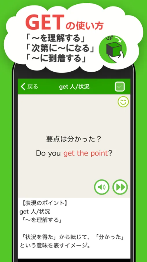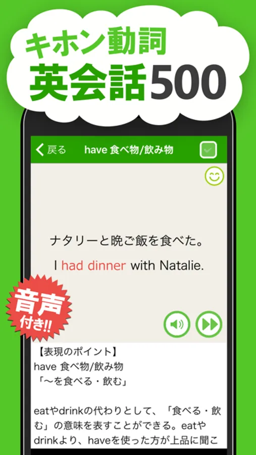 このアプリで、初心者向けの「キホンの10の動詞を使った英会話フレーズ」をマスターしよう!