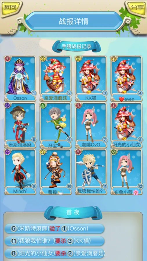 3、绝佳语音复盘,详尽的战报数据!这里不仅能看到每局对局中的玩家身份,还能回放每天的发言语音,复盘甩锅什么的,最有意思了!
