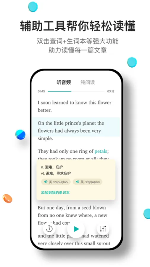 · 即指即译,单词短语双击就能查释义,更有发音收录助力口语提高