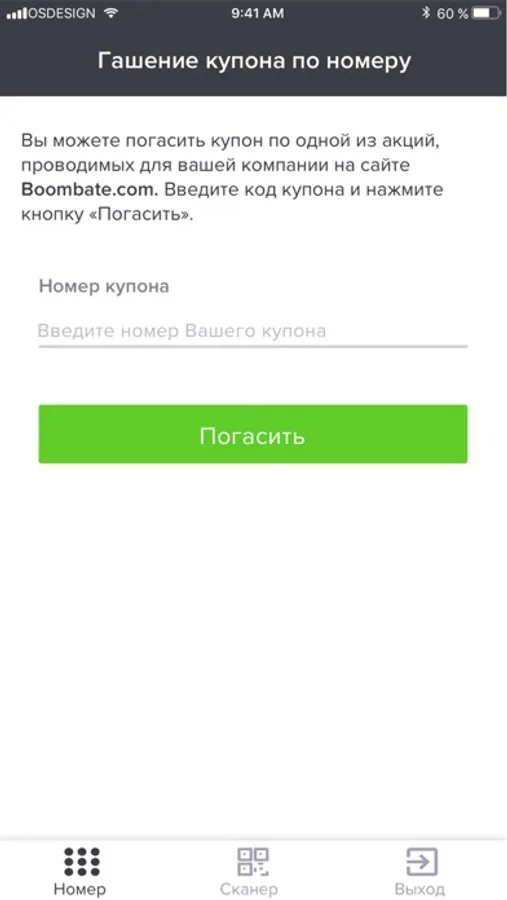 Это приложение разработано специально для партнеров Boombate для упрощения погашения купонов организациями, которые сотрудничают с нашей компанией.