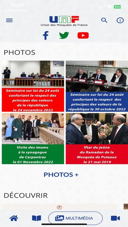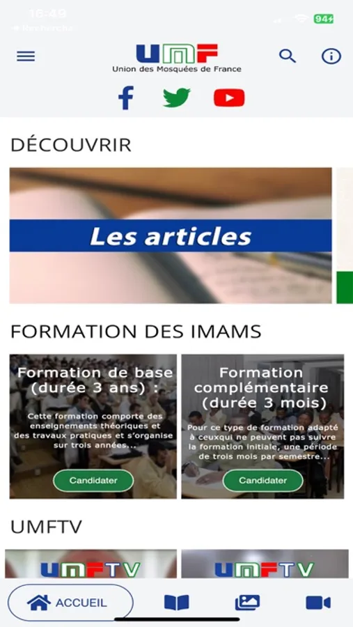 Umf est une application éditée par l’Union des mosquées de France (UMF) afin de visualiser les contenus de son www.umfrance.fr dans un format adapté aux smartphones et ouvrir l'accès à d'autres services utiles.