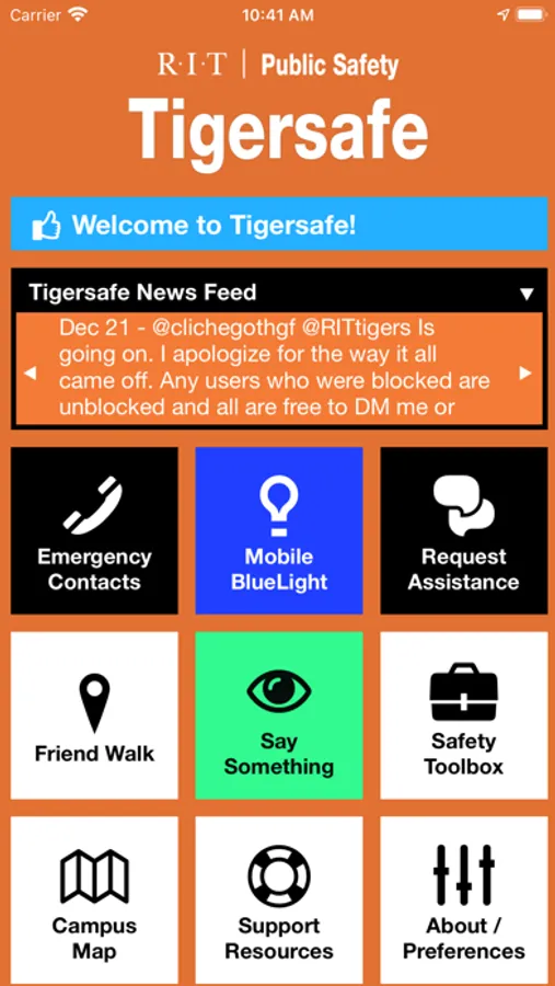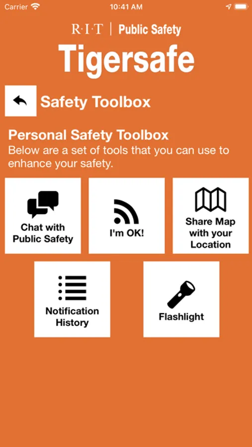Tigersafe is the official safety app of Rochester Institute of Technology. It is the only app that integrates with RIT's safety and security systems. RIT Public Safety has worked to develop a unique app that provides students, faculty and staff with added safety on the RIT campus. The app will send you important safety alerts and provide instant access to campus safety resources.