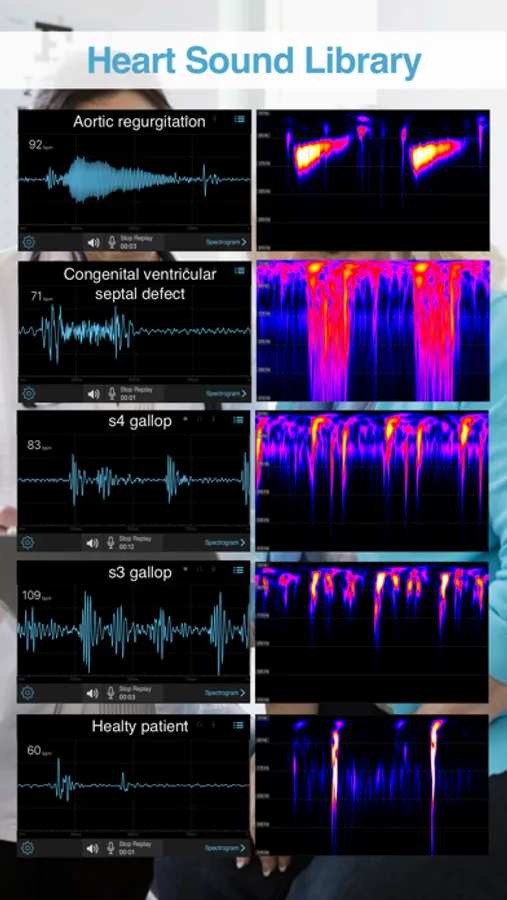 There is a list of previously recorded hearth sounds that you can play, listen and visualize using the spectrogram and time domain graphical interface. Improve your knowledge and skill at identifying various conditions.