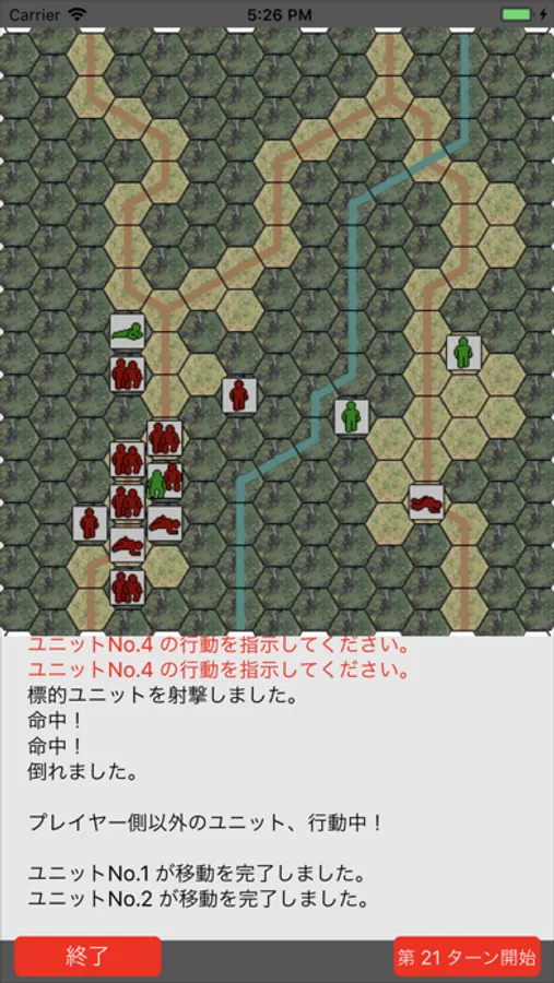 操作はいたって簡単。プレイヤー側の「兵士」をタップすると表示される「指示」を選択し、対象の「敵兵」や「地面」をタップするだけ。複雑なことはすべてスマートフォンが担当します。