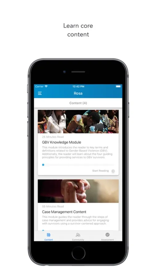 Rosa provides key content on gender-based violence knowledge, case management, communication and attitude skills; offers self or supervisor-administered skills assessments; and a community space for users to expand their learning through facilitated remote discussions and distance supervision.