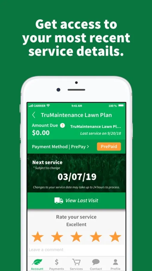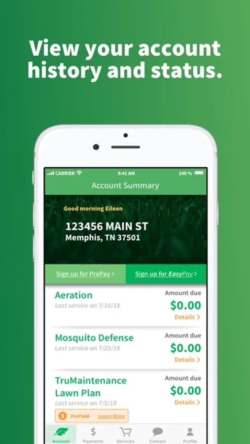 Manage all your lawn care needs on the go with the TruGreen mobile app. You’ll be able to access, update, and provide feedback on all of your TruGreen lawn services in one convenient place – no more phone calls needed! Real-time notifications will keep you informed of your specialist’s ETA before they arrive, and their progress after the visit. To sign up, you’ll need your TruGreen account number from a previous bill or email communication.