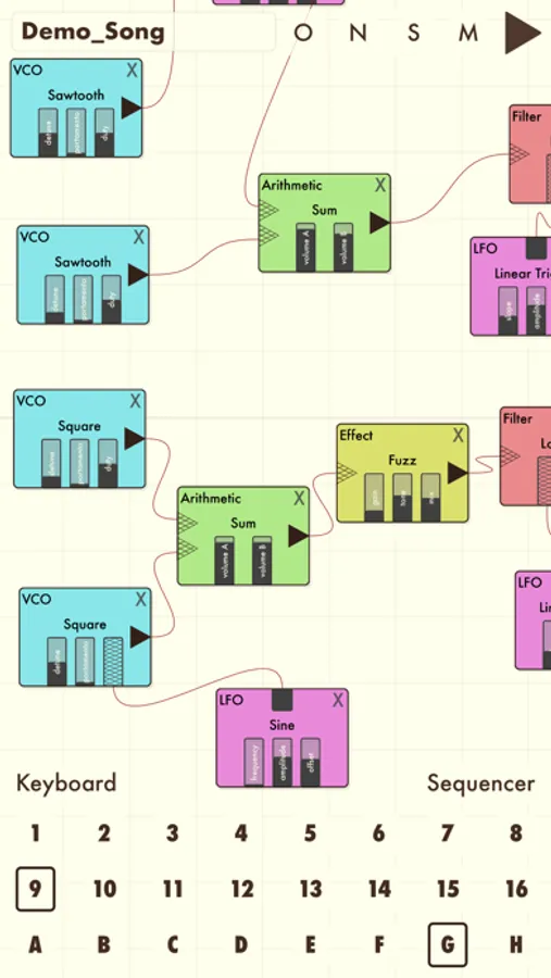 Making a new synthesizer is easy: just add modules with a double-tap and wire up your architecture by dragging between connectors. Available modules include: