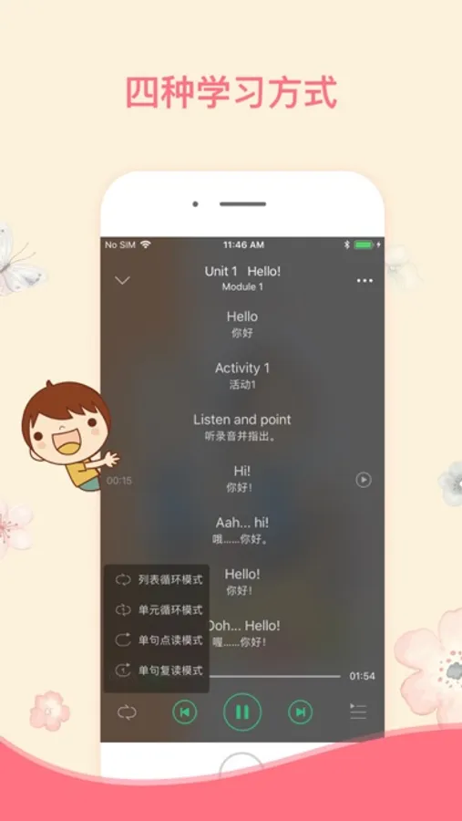 2.具有自动顺序播放,单元循环播放,句子点读,句子点读复读功能。