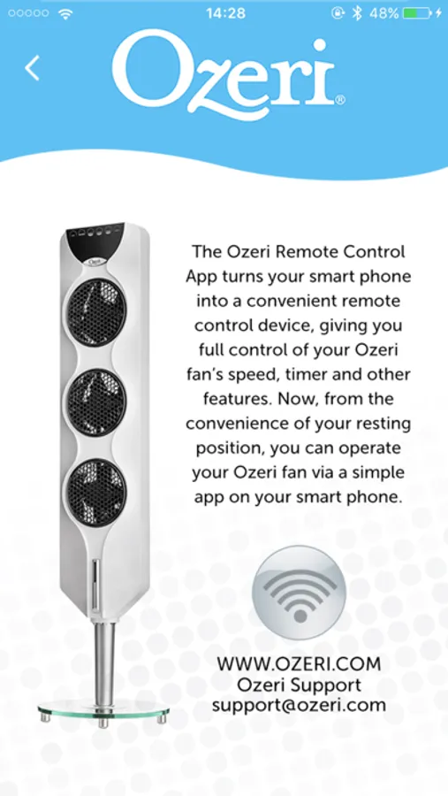 The OZFX turns your iPhone into a convenient remote control device, giving you full control of your Ozeri Bluetooth controlled fan’s speed setting, timer, LCD brightness and more. Now, from the convenience of your resting position, you can control your Ozeri fan with push-button simplicity. The Ozeri OZFX Remote App works alongside the Ozeri Bluetooth fan’s included remote control unit so that you can enjoy a 2nd remote control method, or a handy backup in case you lose the included remote control unit. With the Ozeri OZFX Remote App, your fan can be now controlled in 3 ways: