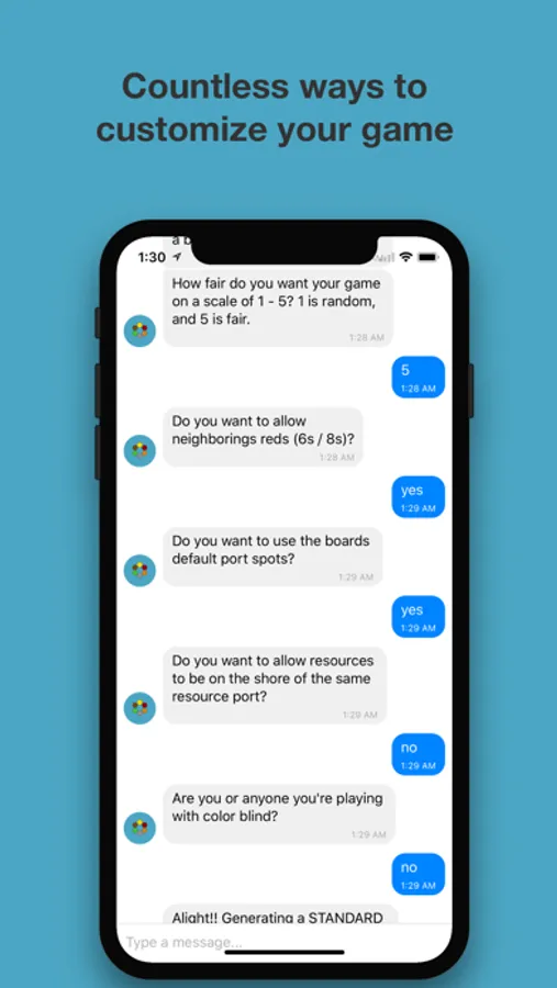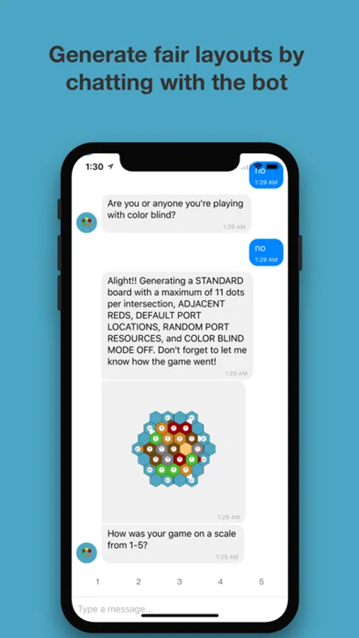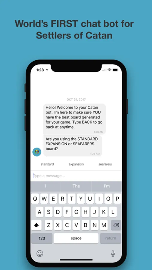 I am the first ever Settlers of Catan chat bot! Strike up a conversation with me, your Catan Bot, and you will have the perfect board for your game every time! The Standard board is free, and the Expansion and Seafarers are available for purchase.