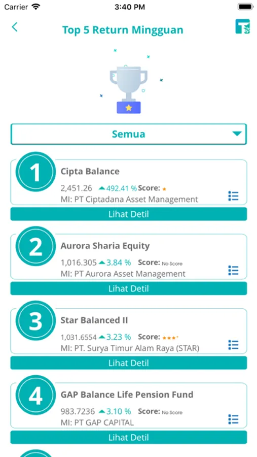 Fitur ini merekap kinerja reksadana dan menampilkan produk-produk teratas berdasarkan kinerja mingguan. Pengguna juga dapat melihat detil peringkat produk tersebut berdasarkan kinerja bulanan dan tahunan.