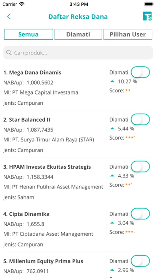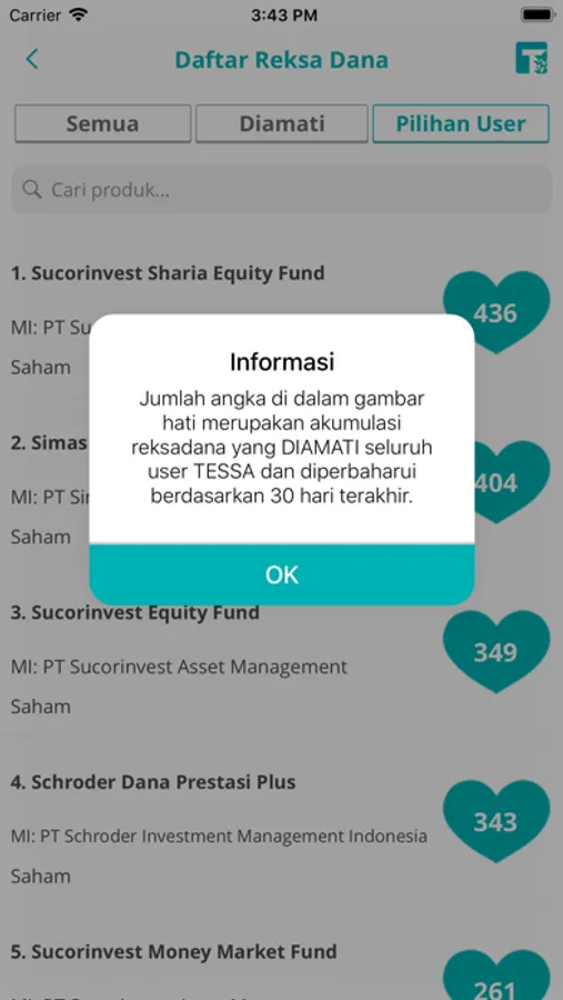 Ingin tahu reksadana apa yang paling banyak diamati oleh pengguna TESSA keseluruhan? Fitur ini akan memberitahu Anda dalam menu Pilihan User