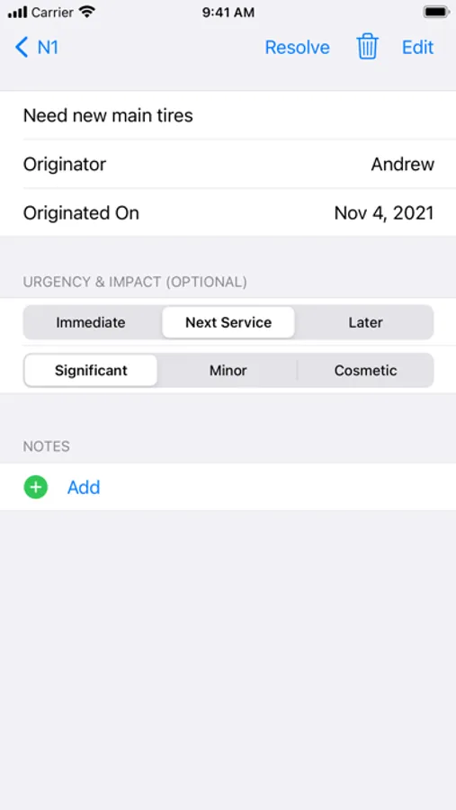 • Track items replaced on condition, e.g. tires, batteries, etc.