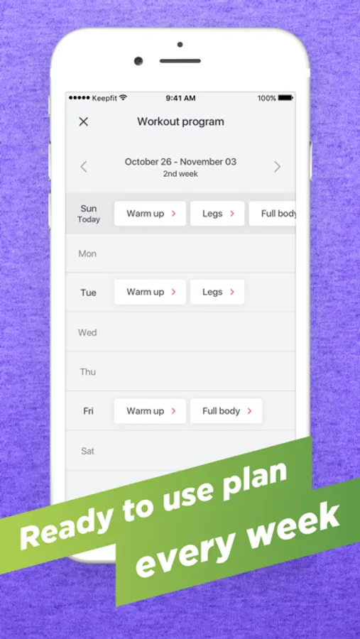Every week, you will receive a ready to use training plan, which you can easily set into motion with one tap. The app includes complete instructions and techniques for each exercise to keep you free from injuries.