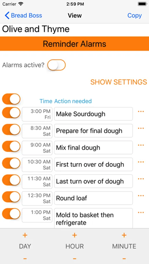 Bread Boss creates alarms or notifications to remind you when each important task needs to be done, so you don’t need to worry or keep track of time. You can easily shift the alarms forward and back to align with your personal schedule. Once you’ve perfected your recipe, you can photograph the result to save with the recipe and share it with your fellow Bread Bosses.
