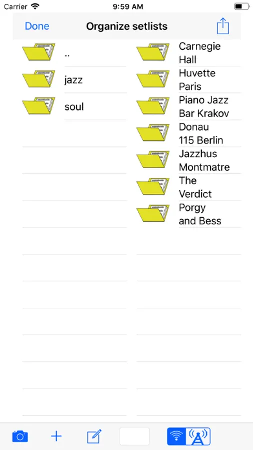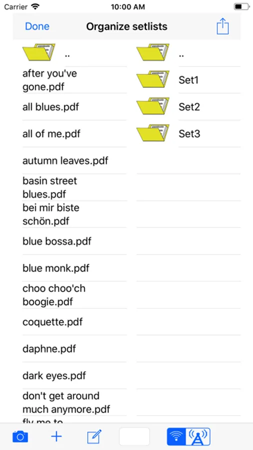 The second part manages your music sheets stored local or on Dropbox. Your Dropbox files are downloaded to your local storage. Alternatively, you can drag files from your Mac or PC to the EasyStage directory on your iPad or iPhone using Finder or iTunes. You can create different set lists for each gig by dragging files to the concerning set list.
