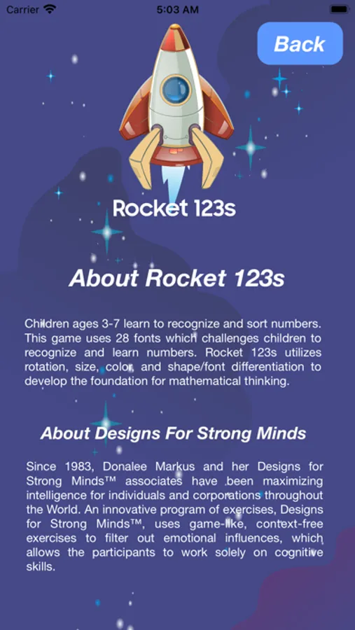 Children ages 3-7 learn to recognize and sort numbers. This game uses 28 fonts which challenges children to recognize and learn numbers. Rocket 123s utilizes rotation, size, color, and shape/font differentiation to develop the foundation for mathematical thinking.