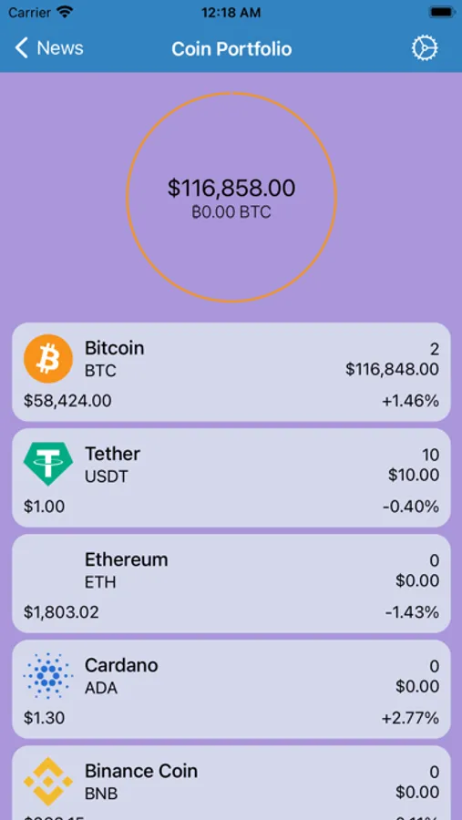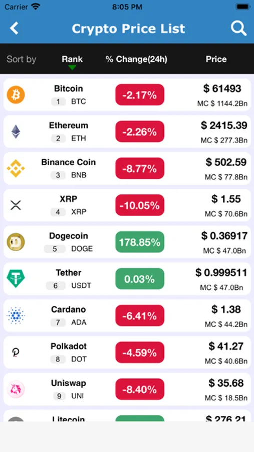 Price list screen where you can check all crypto prices and can sort that listing based on Ranks, Most profits and losses.