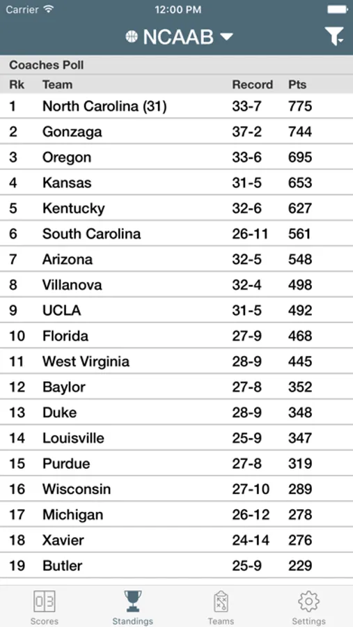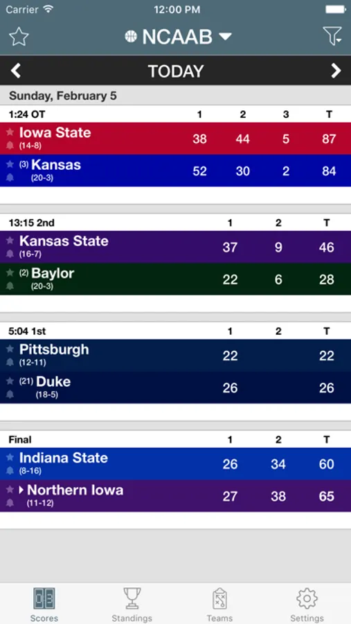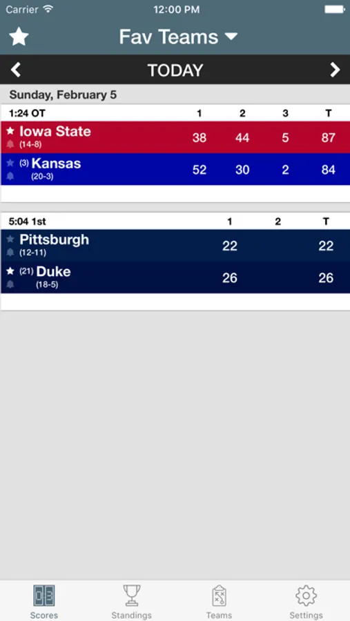 Setup your favorite teams, and view them all on the same page for easy browsing. We made it easy to check out college basketball stats and analyze your favorite teams scores throughout the season!