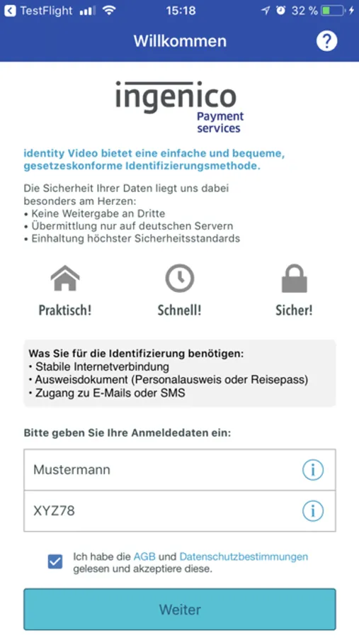 Die identity Video Identifizierung für Ingenico ermöglicht es Ihnen, sich schnell, sicher von Überall identifizieren zu lassen. Um diesen Vorgang durchzuführen, benötigen Sie lediglich ein gültiges Ausweisdokument, eine stabile Internetverbindung und Zugang zu Ihren E-Mails oder SMS. Der Identifizierungsvorgang erfolgt durch einen Video-Chat und dauert nur wenige Minuten.