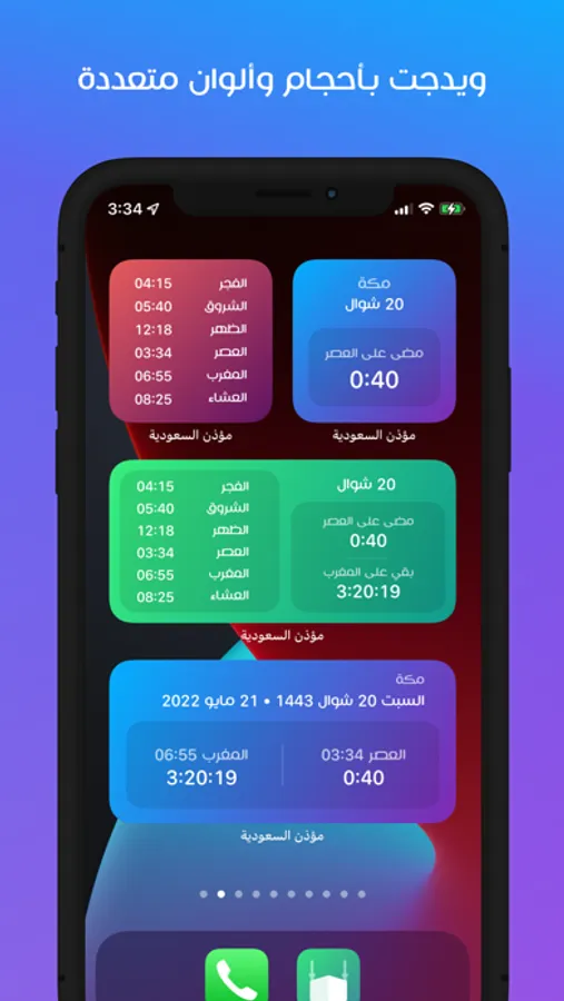 • ويدجت الشاشة الرئيسية لوصول سريع لأوقات الصلاة بأحجام وأنوع وخلفيات متعددة