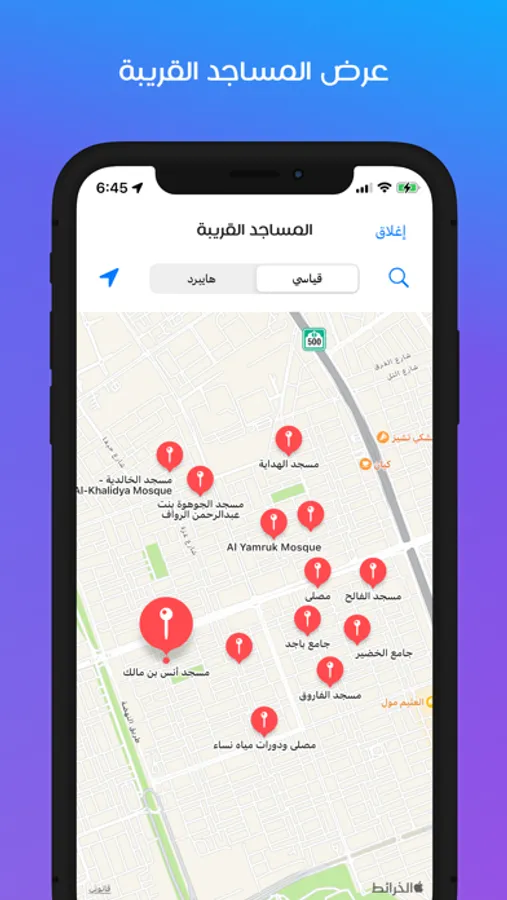 • عرض المساجد القريبة مع إمكانية البحث و الانتقال لأي مسجد