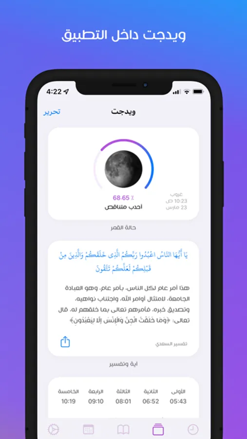 • مجموعة منوعة من الويدجت داخل التطبيق مثل: آية وتفسير, أعمال اليوم والليلة, حالة القمر, حديث اليوم, أوقات الإقامة