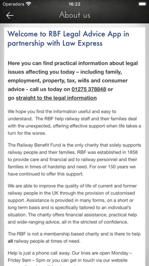 This App provides legal information and guidance and covers topics such as; Motoring, Employment, Separation, Tax & Wills etc.. It gives further information about the Railway Benefit Fund and if the information they seek is not in the articles supplied they can request extra help - there is also a feedback form to allow users to comment on App and put forward any further improvements ideas.