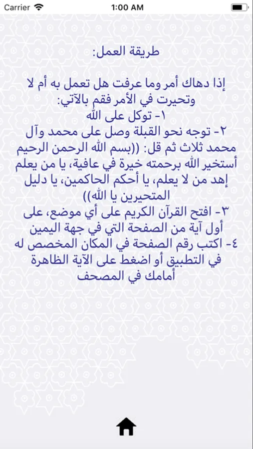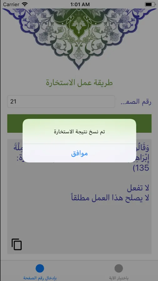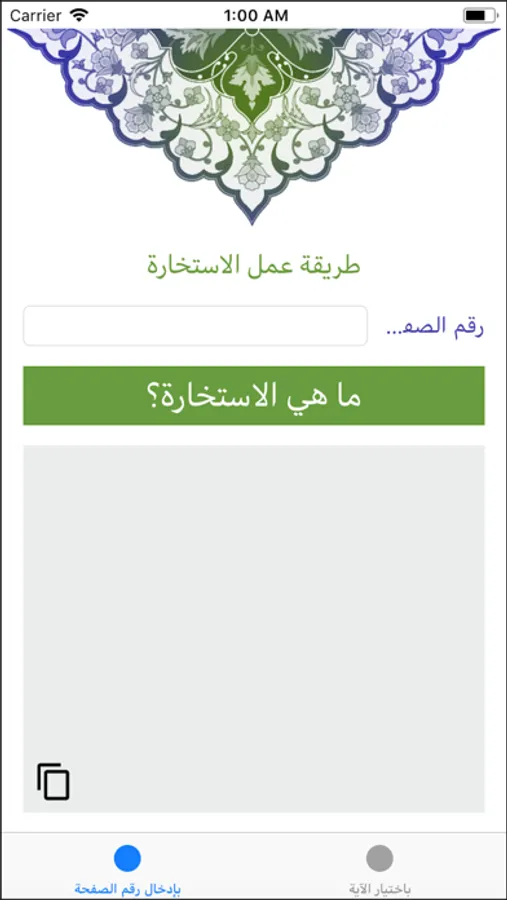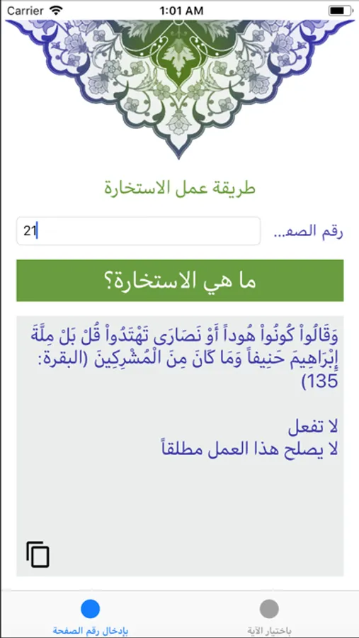 تطبيق خيرة الصادق يسمح للمستخدم إدخال رقم الصفحة من القرآن الكريم لخيرته، ثم يعرض الخيرة على شاشة المستخدم.