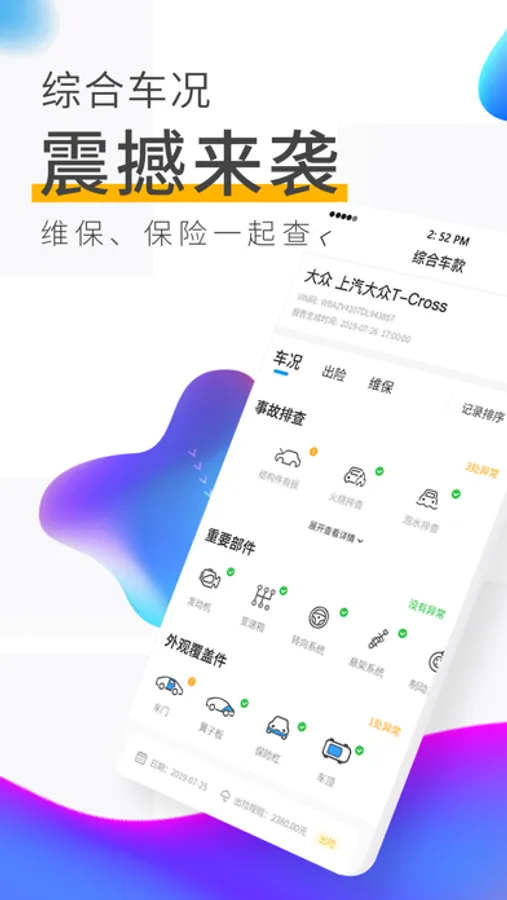 2.出险:车辆历史出险记录,出险经过、维修内容一目了然,完美杜绝事故车