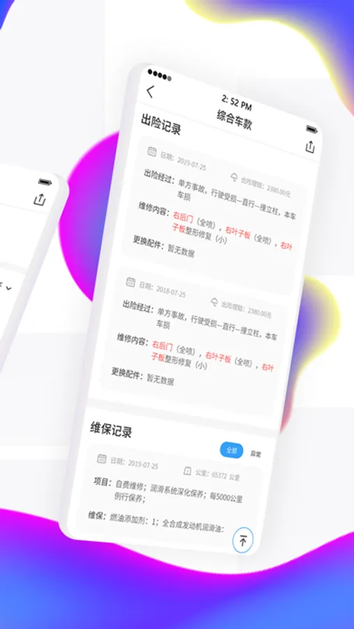 1.维保:车辆历史维修保养状况,查询品牌全面覆盖,掌握细节收车不吃亏