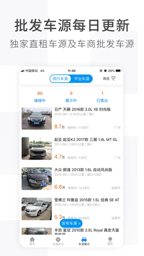 1.平台车源:不定时展示最新处置车源,实时收集线上车e估专属200+车商群批发车源