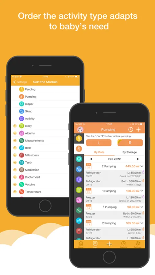 - Breast Pumping: Start a timer to track pumping session and record the available amount in different storage environment.