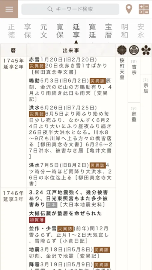 これ以外に地震や大雨・疫病・豊作・大雪など様々な出来事が詳細に記載されており、これらの事と日本の出来事、そして加賀藩の出来事が一度に確認できます。年表内の様々なキーワードはタップすればGoogle検索。