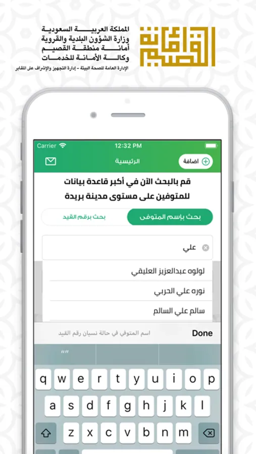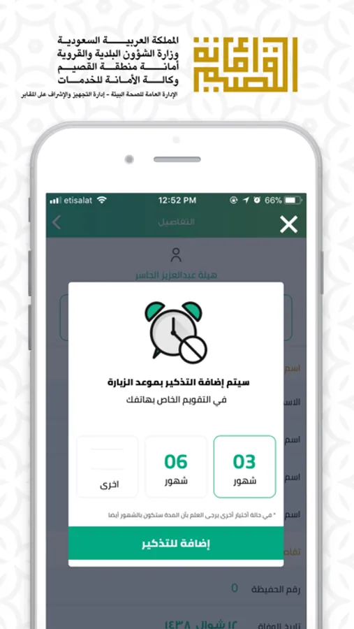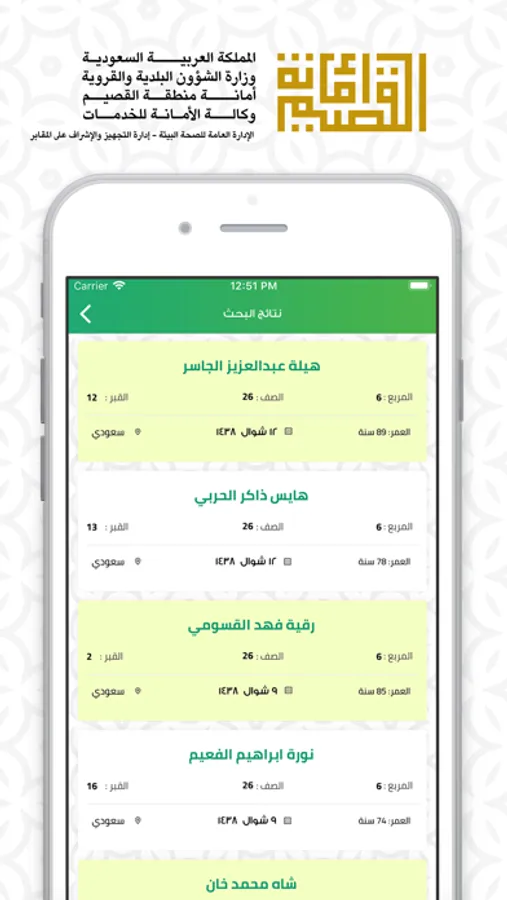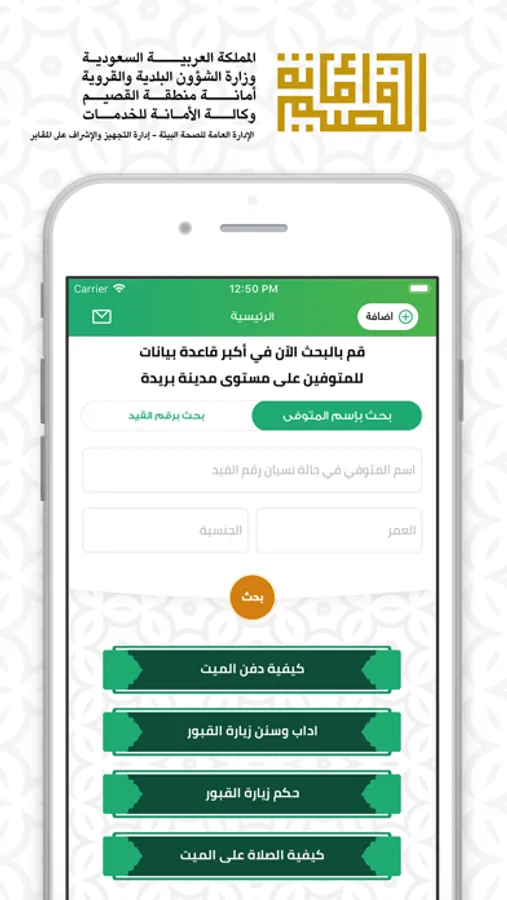 التطبيق يعمل تحت مظلة أمانة منطقة القصيم ممثلاً بإدارة التجهيزات والاشراف على المقابر