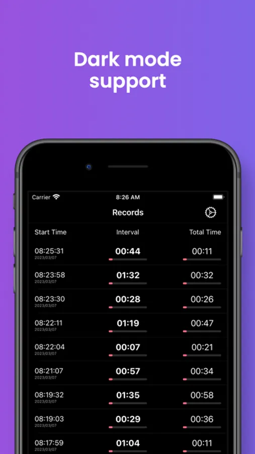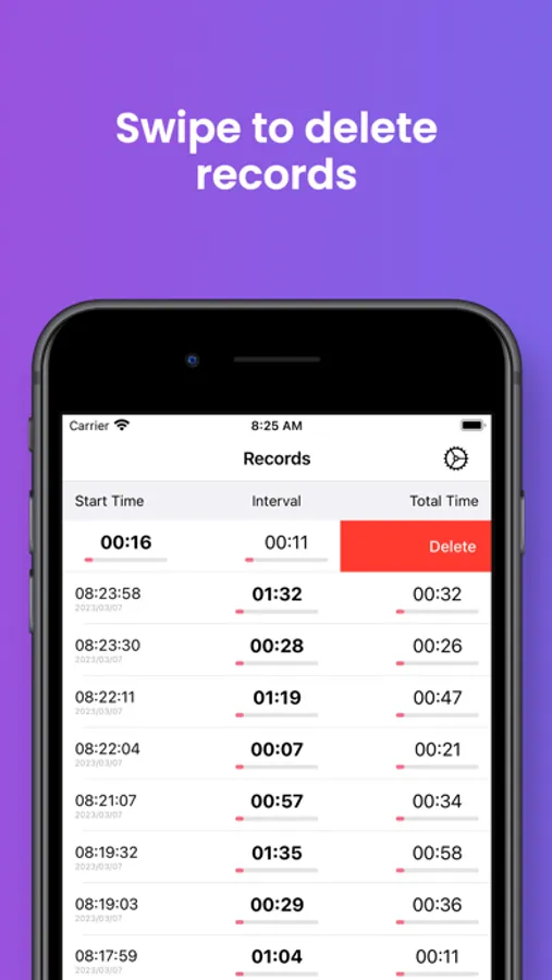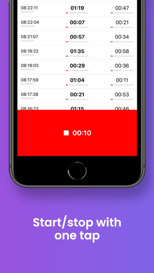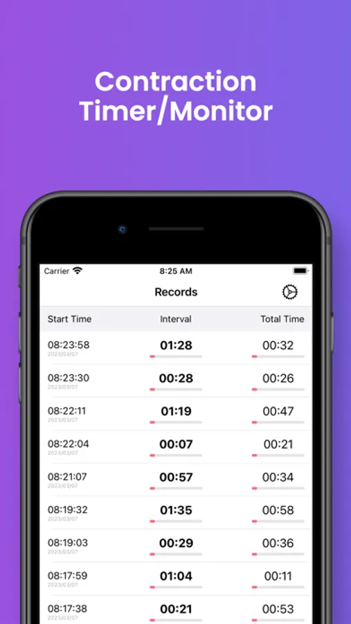It's really easy to use to, just press the start/stop button at the top of the home screen and the app will automatically generate a list of contractions - pre-filled with duration, gap and time.