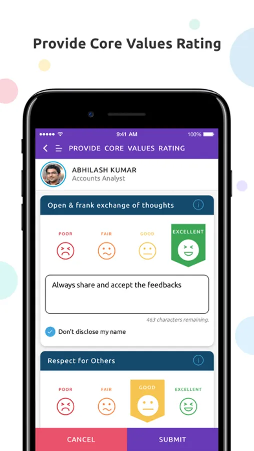 * Provide values adherence rating to your peers & leaders (Core Values Rating)