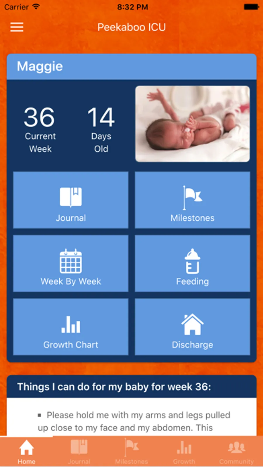 The Peekaboo ICU PREEMIE app is packed full of features and broken down into organized and easy to navigate sections including: