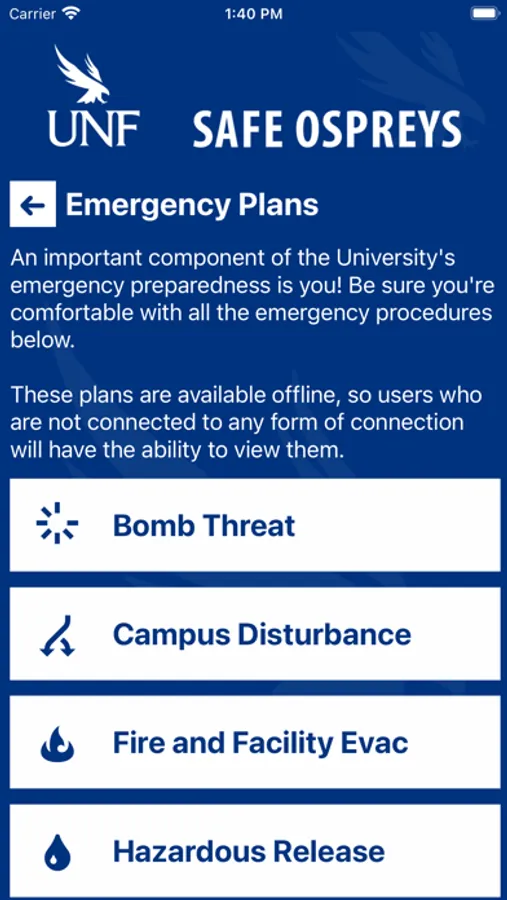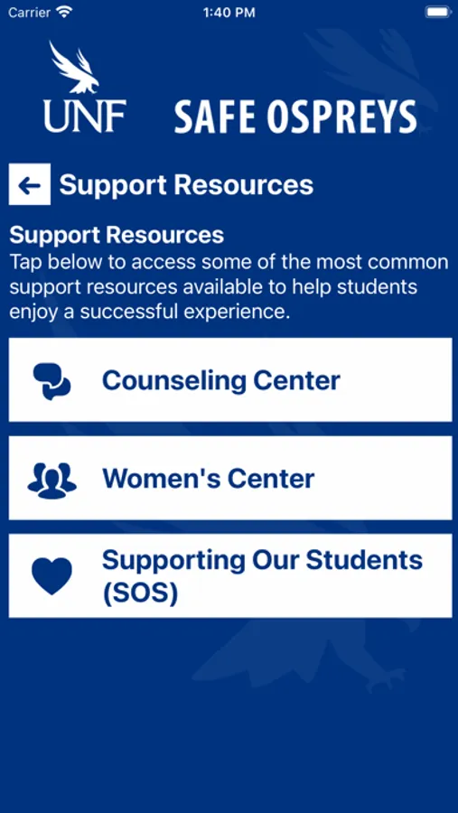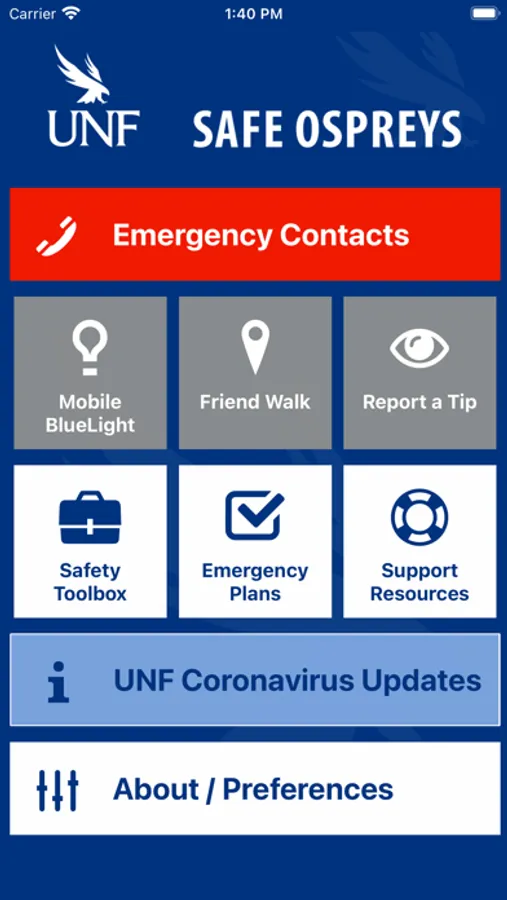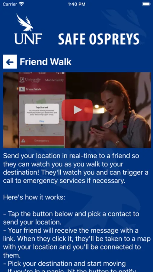 Safe Ospreys is the official safety app of University of North Florida. It is the only app that integrates with UNF’s safety and security systems. UNF Police Department has worked to develop a unique app that provides students, faculty and staff with added safety on the UNF campus. The app will send you important safety alerts and provide instant access to campus safety resources.